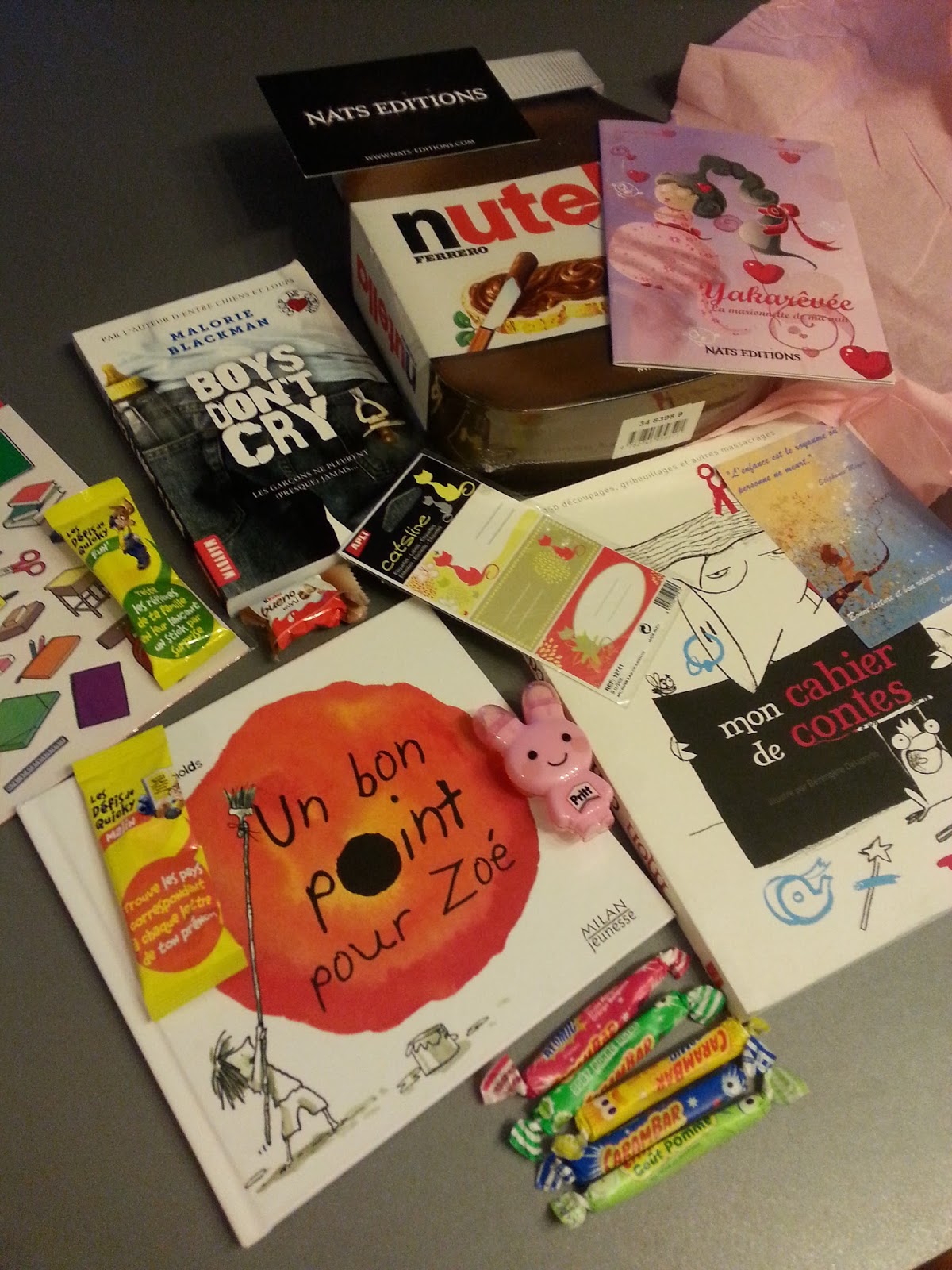 Pour les livres, choix parfait. Nous avons déjà lu plusieurs fois le livre pour Romane et le mien est mis dans ma PAL. J'aime beaucoup les petits autocollants précisant "coup de cœur" car je les retiendrai plus facilement. Le cahier de contes est idéal pour les enfants, les bonbons aussi d'ailleurs. Le petit livre de Nats Edition est très joli et ma fille l'aime beaucoup car il est rose...